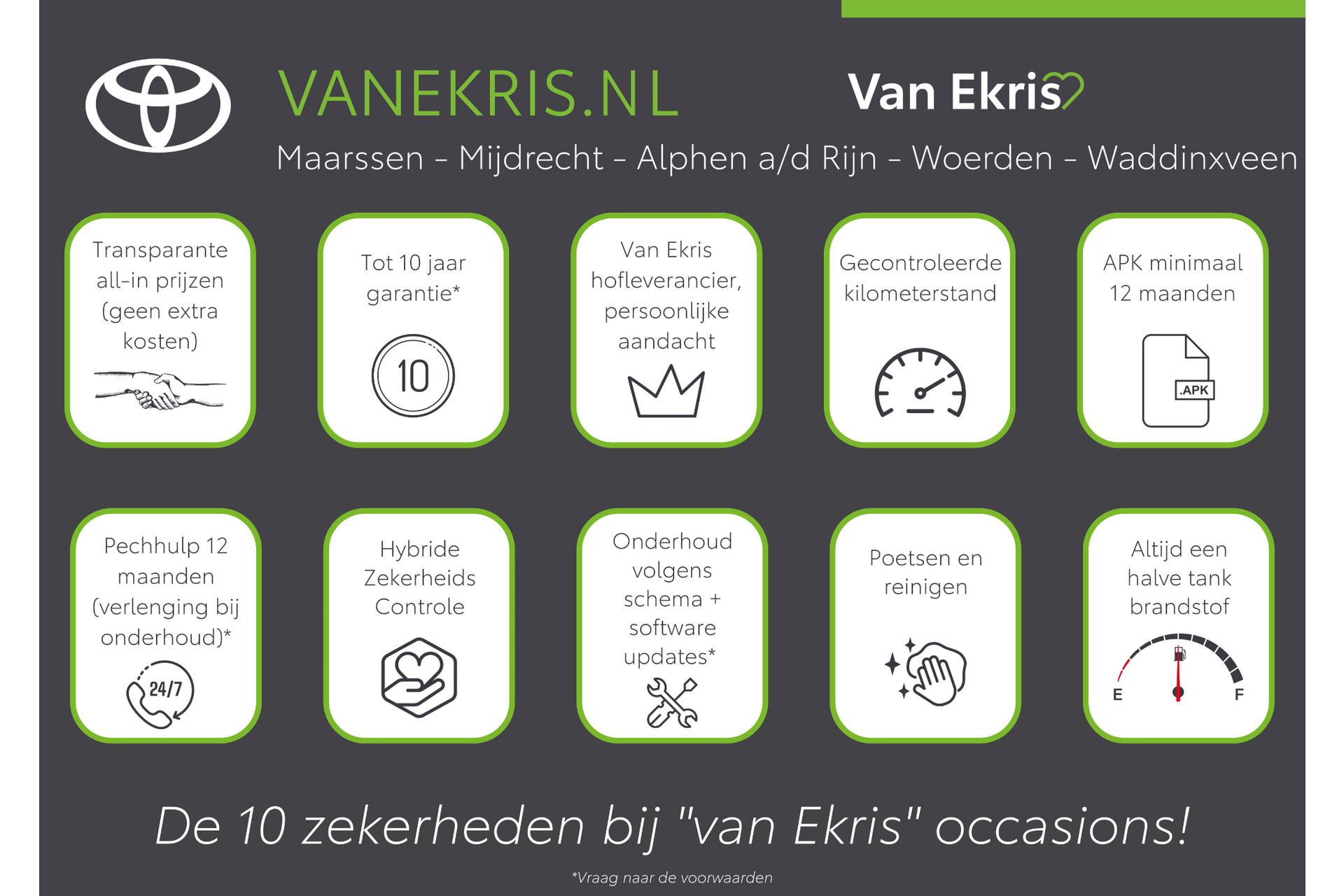 Vraag naar de actievoorwaardenInteresse? Neem dan contact met ons op voor het maken van een afspraak. De getoonde prijs is incl. garantie en onderhoud t.w.v. € 599,-, hiervoor ontvang u het volgende: Toyota garantie tot 10 jaar*, Volledige onderhoudsbeurt, geldige APK, registratie, volledige poetsbeurt en reiniging van het interieur, halve tank brandstof, pechhulp pas 24/7 Europa.