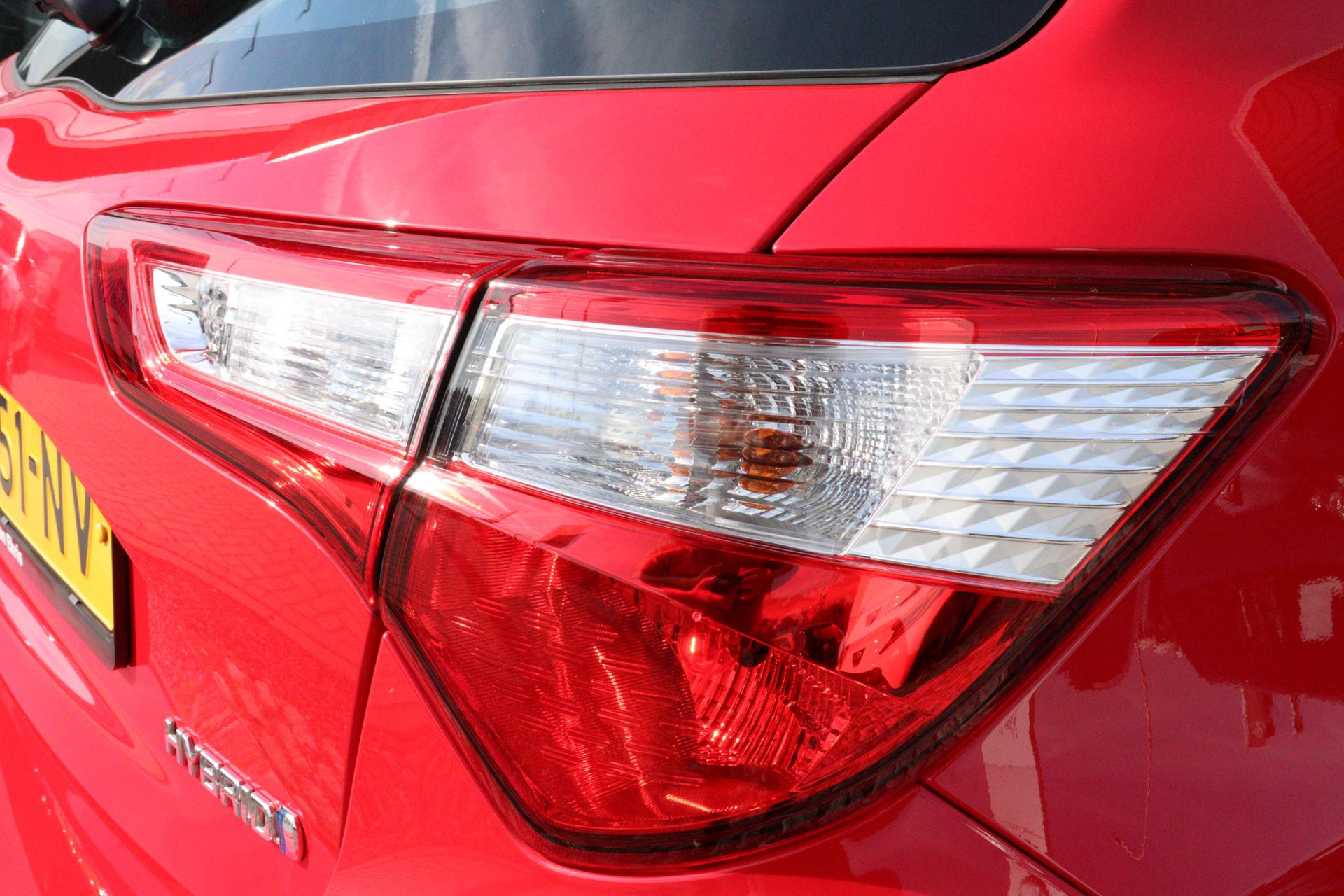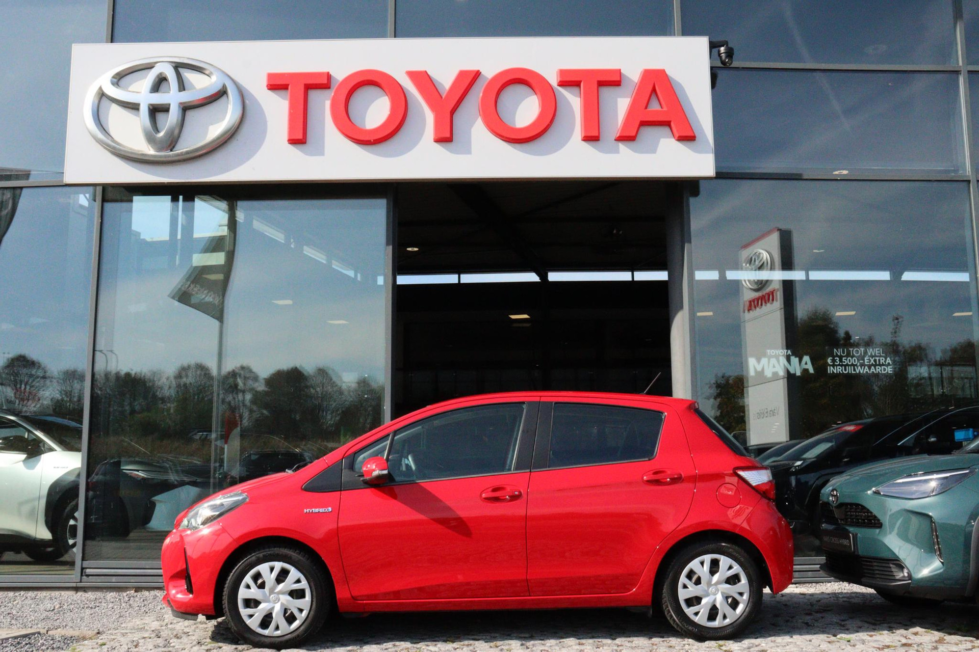 Toyota Yaris 1.5 Hybrid Active In de kleur Fire Red, Is Dealer onderhouden en is voorzien van, Trekhaak, Climate Control, Cruise Controle, Bluetooth, Parkeercamera en nog veel meer!